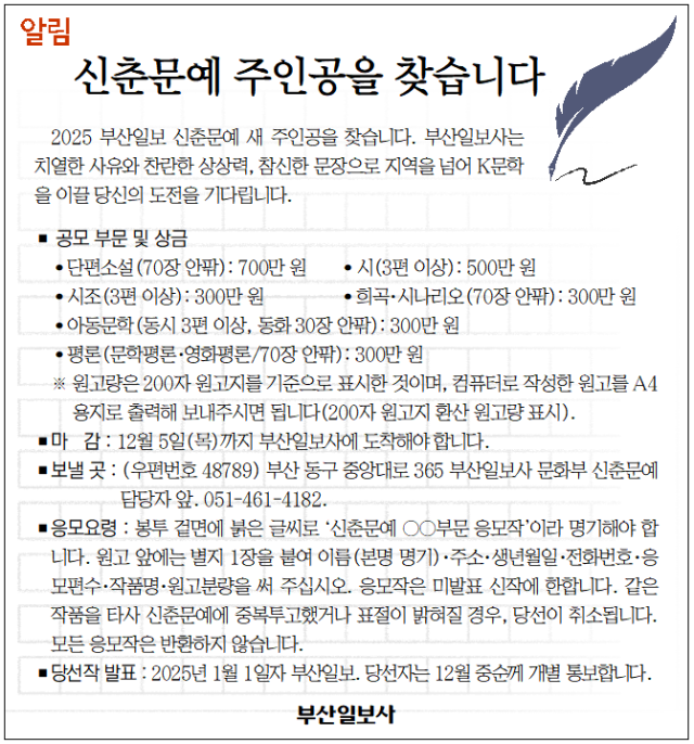 2025 부산일보 신춘문예 새 주인공을 찾습니다. 부산일보사는 치열한 사유와 찬란한 상상력, 참신한 문장으로 지역을 넘어 K문학을 이끌 당신의 도전을 기다립니다.