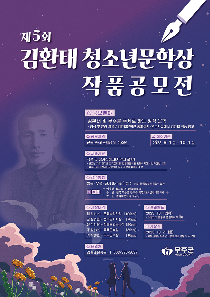 무주군에서는 김환태의 순수비평정신을 알리고 문화적 업적을 기리는 동시에 전국 청소년들의 문예 창작 활동을 활성화하고자 다음과 같이 공모하오니, 창의적이고 열정 가득한 청소년 여러분의 많은 응모 바랍니다.