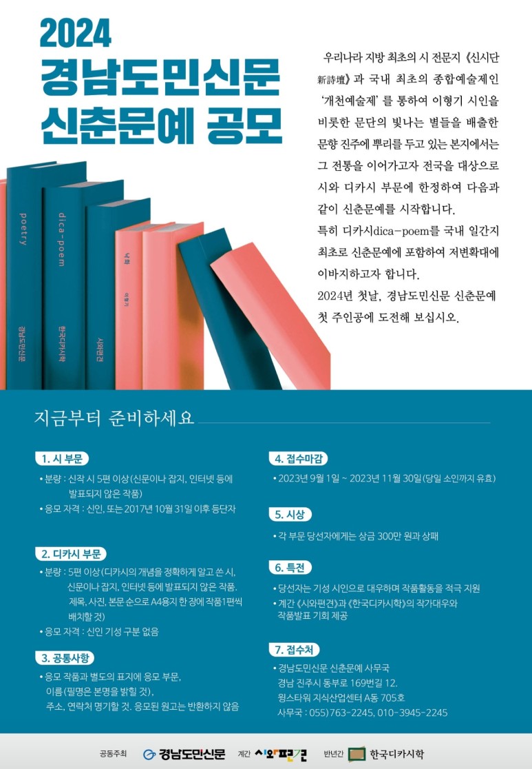 | <디카시 공모> 2024 경남도민신문 신춘문예 공모 2023년 11월 30일(당일 소인까지 유효) (0) | 2023.09.27 |