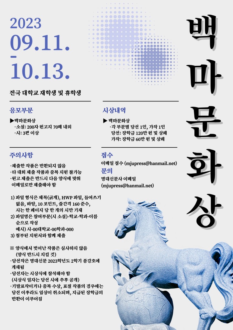| <디카시 공모> 제2회 익산 디카시 공모전 2023년 10월 13일(금) 자정까지 (0) | 2023.09.27 |
