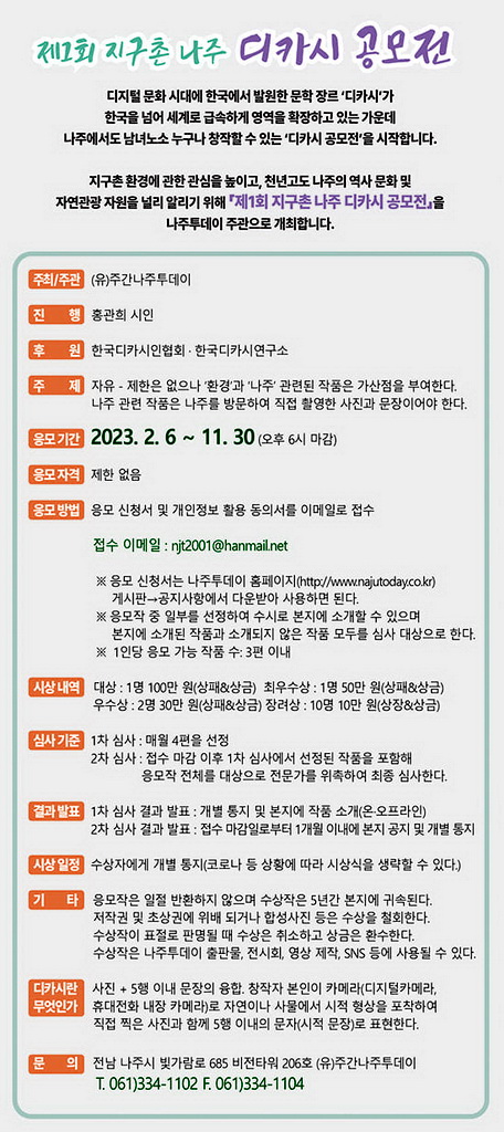 지구촌 환경에 관한 관심을 높이고, 천년고도 나주의 역사 문화 및 자연관광 자원을 널리 알리기 위해 「제1회 지구촌 나주 디카시 공모전」을 나주투데이 주관으로 개최합니다.